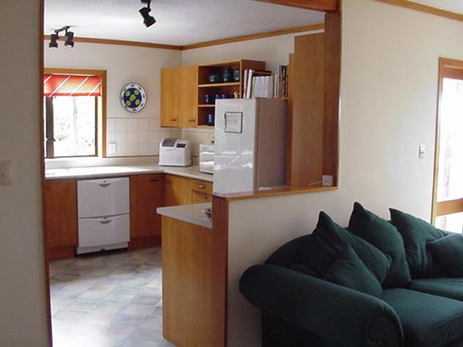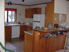 Brent and I have now moved into our new house! The moving day (on 4 November 2000) was a bit of a shambles - it rained all day [Thankfully we had hired removal men to take the bulk of the furniture - so all our things were transported safely with no breakages and only one couch got wet (but the water stain seems to have disappeared)]. It took us ages to move and unpack all our other stuff (I don't know how we accumulated so much?!) - but most of the boxes are now unpacked and put away. Unfortunately the previous owner took all the shelves etc in all the cupboards with her (!!! Not the usual thing in New Zealand!) so we have no shelves or clothes rails to put our cupboard stuff on (except for our own new wardrobe) - so there are quite a few thing still in boxes - we hope to sort out the shelving for all these cupboards in the next month. We ended up getting a fair bit of cosmetic work done on the house before moving in - it has been newly painted and carpeted throughout; new lino has been laid in the family room and kitchen; new ceramic tiles by the front door, and a new walk-in wardrobe installation. It made it really nice to move in to - almost like moving into a new house! All that's left to go inside is the blinds and curtains (which we hope to get done before Christmas!), re-covering of the couches in the lounge, and small trimmings such as new handles on cupboards in the kitchen, etc. We're going to leave the bathrooms etc as they are for another year as it has been a bit pricey getting all this work done already! Just to show off how far we've come already, here's a before and after shot of our new kitchen - notice any difference?!