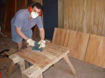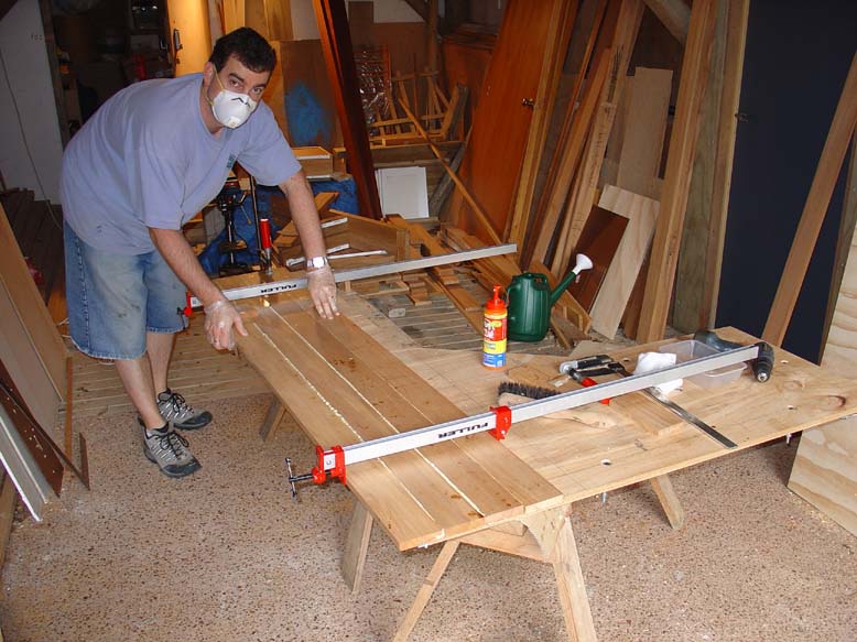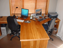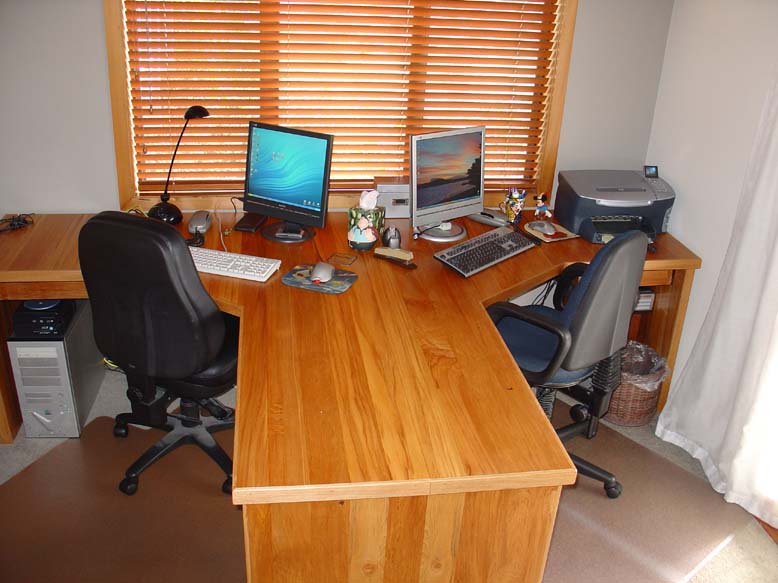 During all this nightmare the bathroom has finally been finished and the carpet throughout the whole house has been re-stretched, room by room. During that we did a rooms shuffle part of which was us moving our study from the largest room upstairs into the much smaller nursery room (about half the previous floor area!). Fitting our two desks in there, filing cabinet etc was a challenge and looked cluttered and it was! Brent decided to build us a combined double-desk which we decided would have to be a T shape up against the end wall. When he told me it would be recycled rimu I was thrilled, but when he brought home the rough recycled narrow planks I was quite dubious about how it would end up (I envisaged it being all bumpy or looking like a deck LOL!). But Brent's amazing carpentry skills certainly came to the fore - the resulting desk is amazing - a real work of art! It took him 5 weekends to do it - including a few very late nights! The first weekend was cutting out the frame and just working out which sections of planks were to go where on the frame (as it was recycled there were marks, nails holes etc all over the place) so that best pieces were on the desk top and front leg and the not-so good on the other less-visible legs etc) and cutting them all to size. Planning was everything! Then the frame was screwed together to check it would work. Then each plank glued and screwed to the frame, and clamped together. Once the planks were all on and the glue dried, the excess glue was scraped off and the edges all cut clean to size. Then it was the mammoth sand-off using a power sander and very rough grit paper as the wood is incredibly hard! Finally, edging applied, final fine sand, polyurethaning (and painting of framing on other side) and then the final construction - in the room! Applying the first layer of polyurethane was very exciting - how beautiful the wood looks - photos can't show it off enough!